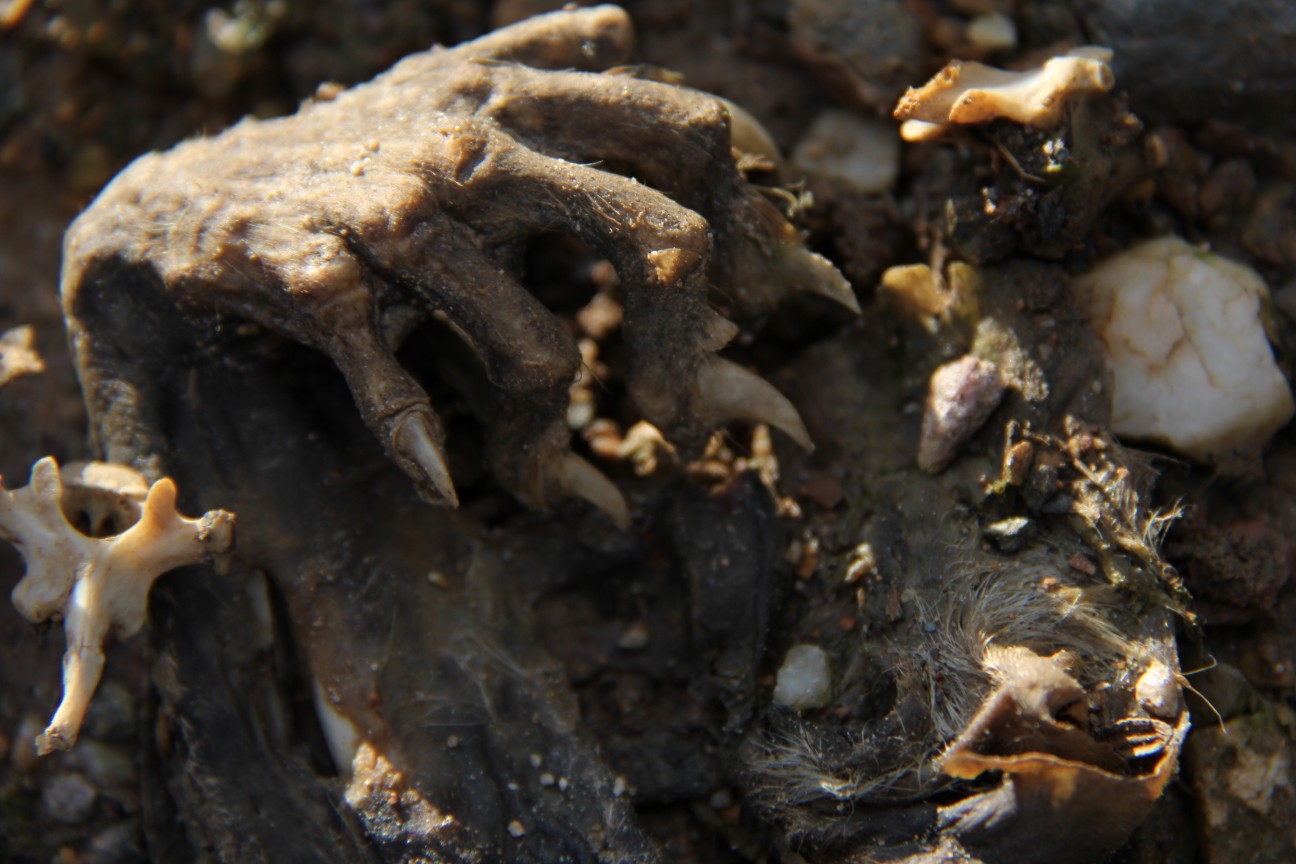 I let him use my camera and saw some of it. A possum, mummified to the track, obviously a victim of industrial poisoning in the name of progress. He still reckoned it looked cool.